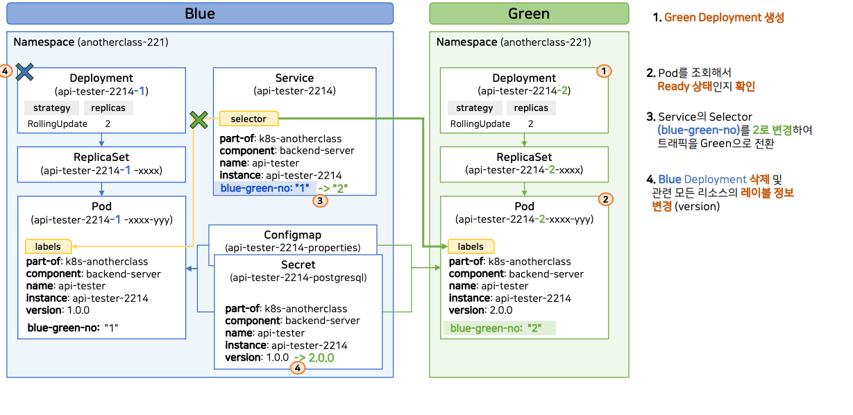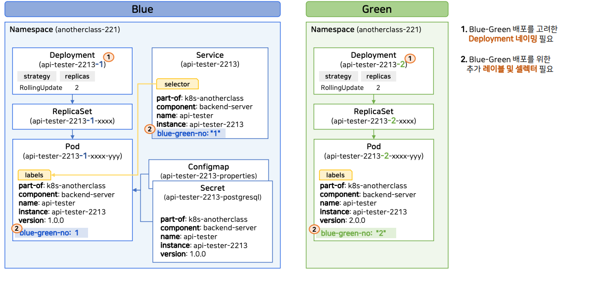 - label을 새로 달지 않으면 blue와 green 모두에게 트래픽이 전달되니 각자의 Deployment 네이밍 필요