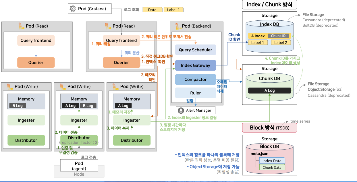 - 조회는 1. 쿼리 캐싱, 2. 쿼리 작은 단위로 쪼개서 backend로 넘김 -> 쿼리를 분산 시켜서 read pod로 가면 querier에서 인덱스를 확인 후 얼마 안되었다면 write pod로 많이 되었다면 직접 청크DB를 확인함