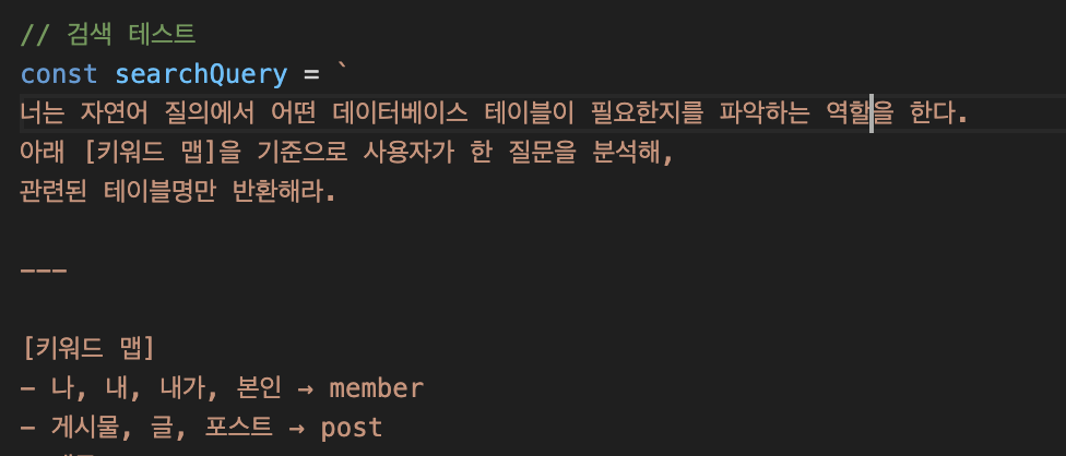 여러 번 확인해보니 RAG 사용 시 "나", "내가 쓴 글" 같은 표현을 member, post와 연결하는 도메인 키워드 맵은 기존 RAG 시스템 대비 정확도를 끌어올리는 데 꽤 도움이 되었다.