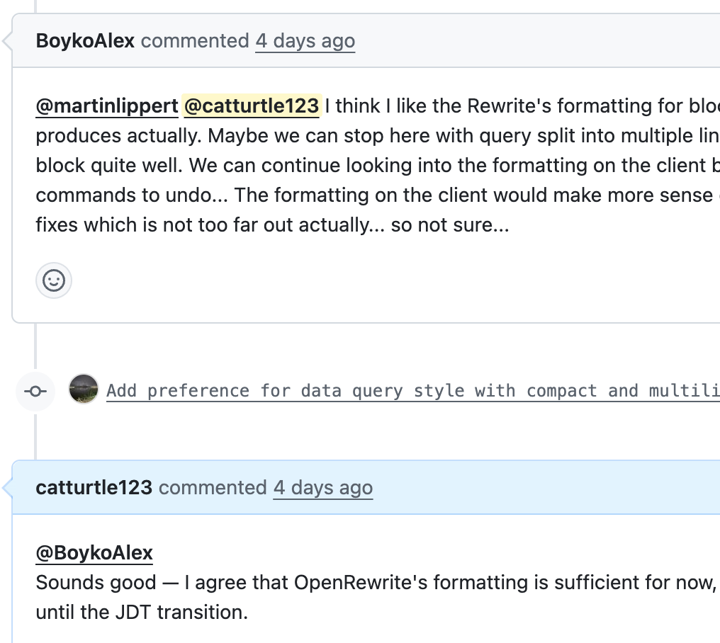 근데 이 쿼리 생성 로직의 이슈가 올라와있어서 보니 자바 15부터 멀티라인이 제공 되는데 여기에는 아직 안 들어와 있어 가독성이 안 좋은 상황이었다. 이 부분을 보완해서 PR을 올렸고 머지가 됐다.